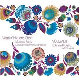The “Vesna” Children’s Choir of Moscow, comprised of 50 select voices ages 6 to 14, is undoubtedly one of the best children’s choirs in the world. Their singing is fully professional, artistic, polished—outstanding in every respect! Unlike the “showcase socialist” institutions of the Soviet era, this choir exists as a private “cooperative” music school, run jointly by the children, their families, and the staff. Since their founding, however, they have received official support and recognition from the Russian government. The music on this album, Ephrem Podgaits’ (b. 1949) Spring Mass, a Latin setting of the Roman Catholic Mass for choir and organ, which premiered in 1997. Although it presents the Mass elements in a somewhat non-traditional order (e. g., Sanctus, Agnus, Benedictus, Kyrie, etc.), this is clearly a piece that represents a major addition to the concert Mass repertoire.