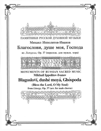"Bless the Lord, O My Soul" (Ps. 103:1-6) is from Ippolitov-Ivanov's beautiful setting of the Divine Liturgy. Arranged here for male chorus, the piece is a delicate musical evocation of a whispered prayer, opening tenderly and continuing in long delicate lines. (Also available in the original Mixed Choir version (Ip004), arranged for Women's Choir (Ip004wc) and for SAB Choir (Ip004sab).