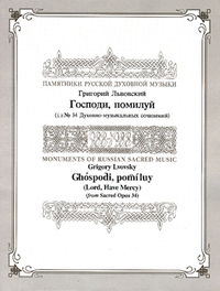 Grigory Lvovsky (1830-1894) was a prominent choral conductor in two of St. Petersburg's largest cathedrals. He was a student of Western Renaissance polyphony and a pioneer in the area of harmonizing traditional church chants for choir. His best-known work, "Ghospodi, pomiluy" (made popular by such groups as the Don Cossack Choir) is uncharacteristic in that it makes no use of any chant melodies; the manifold repetition of the words "Lord, have mercy" musically illustrates and mirrors the raising up and bowing down of an Orthodox bishop, as he performs the ritual of the Elevation of the Holy Cross. (Also available in an arrangements for TTBB and SAB choir.)